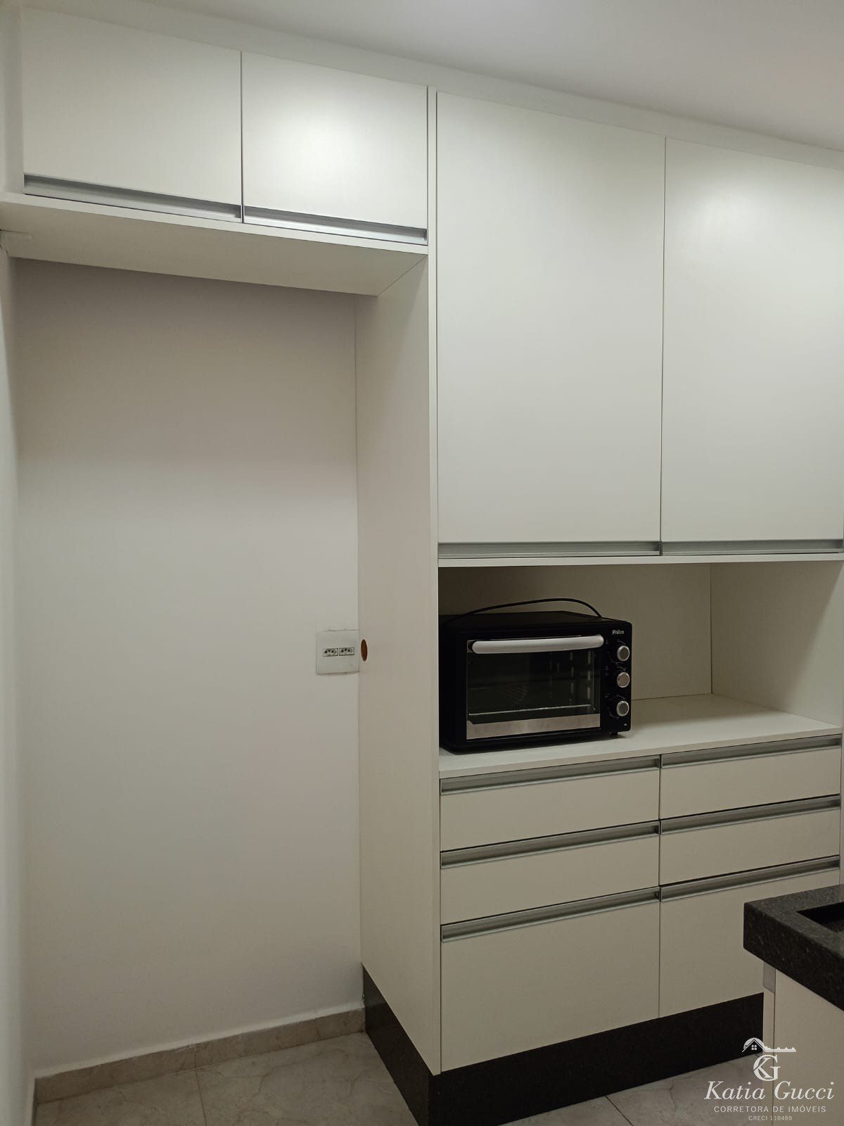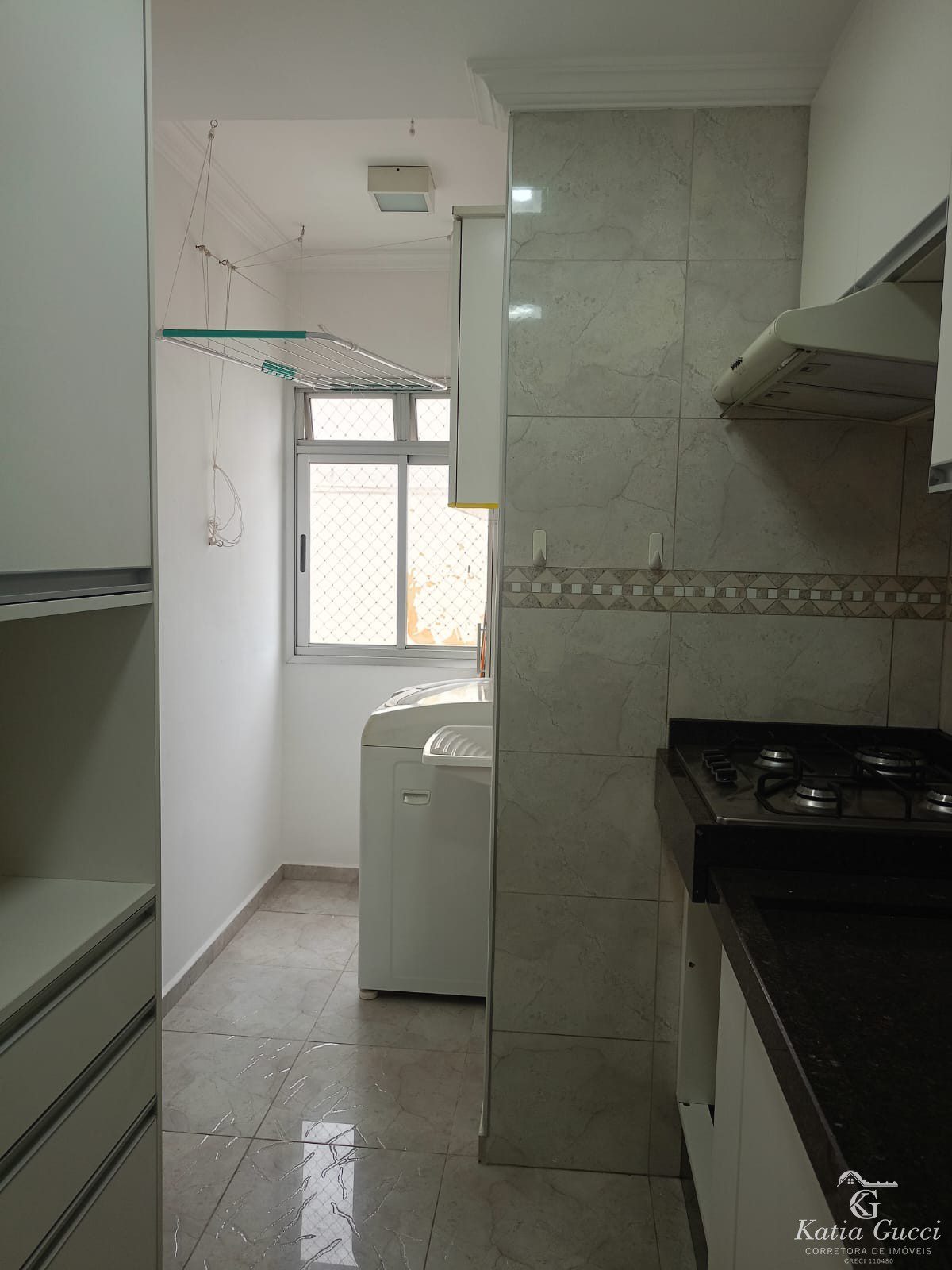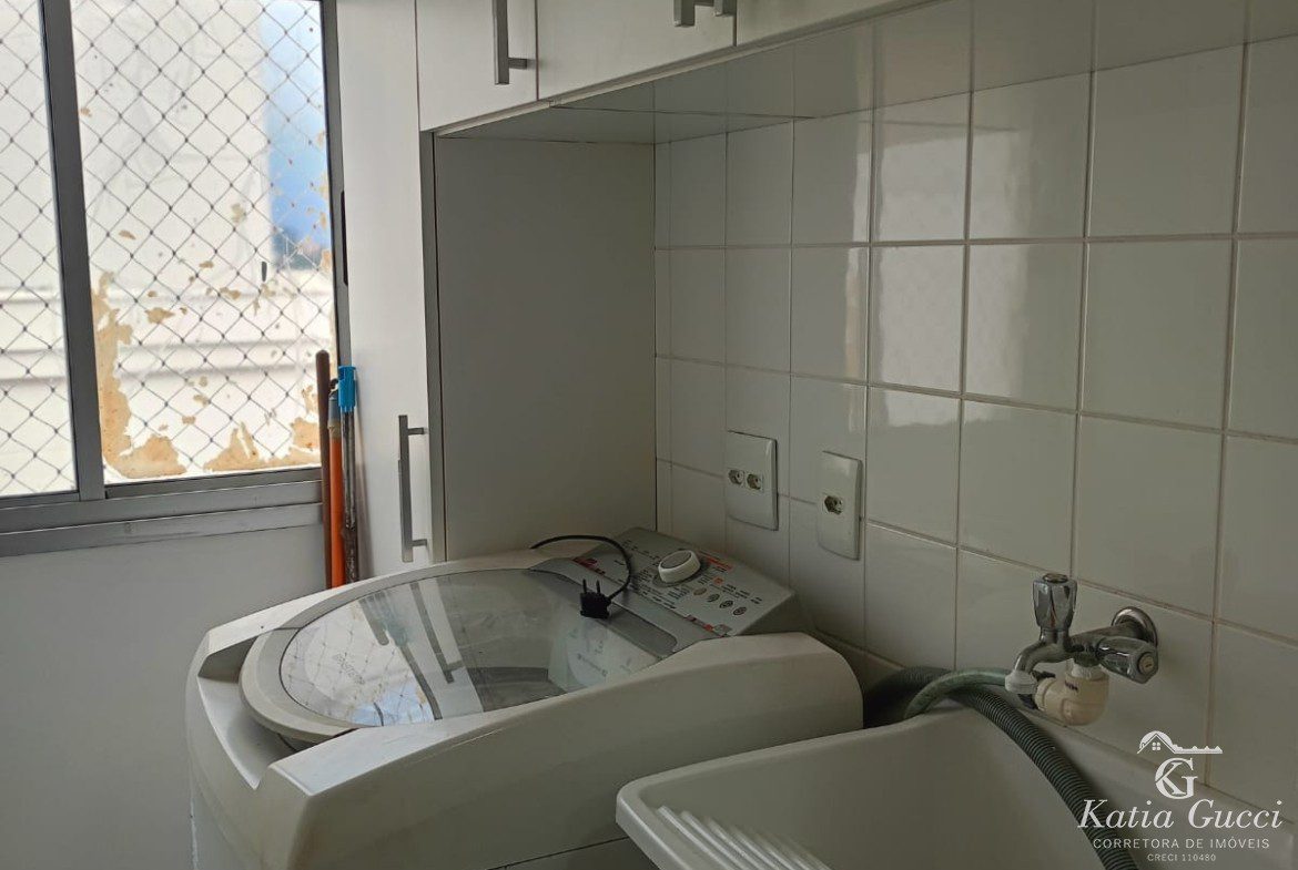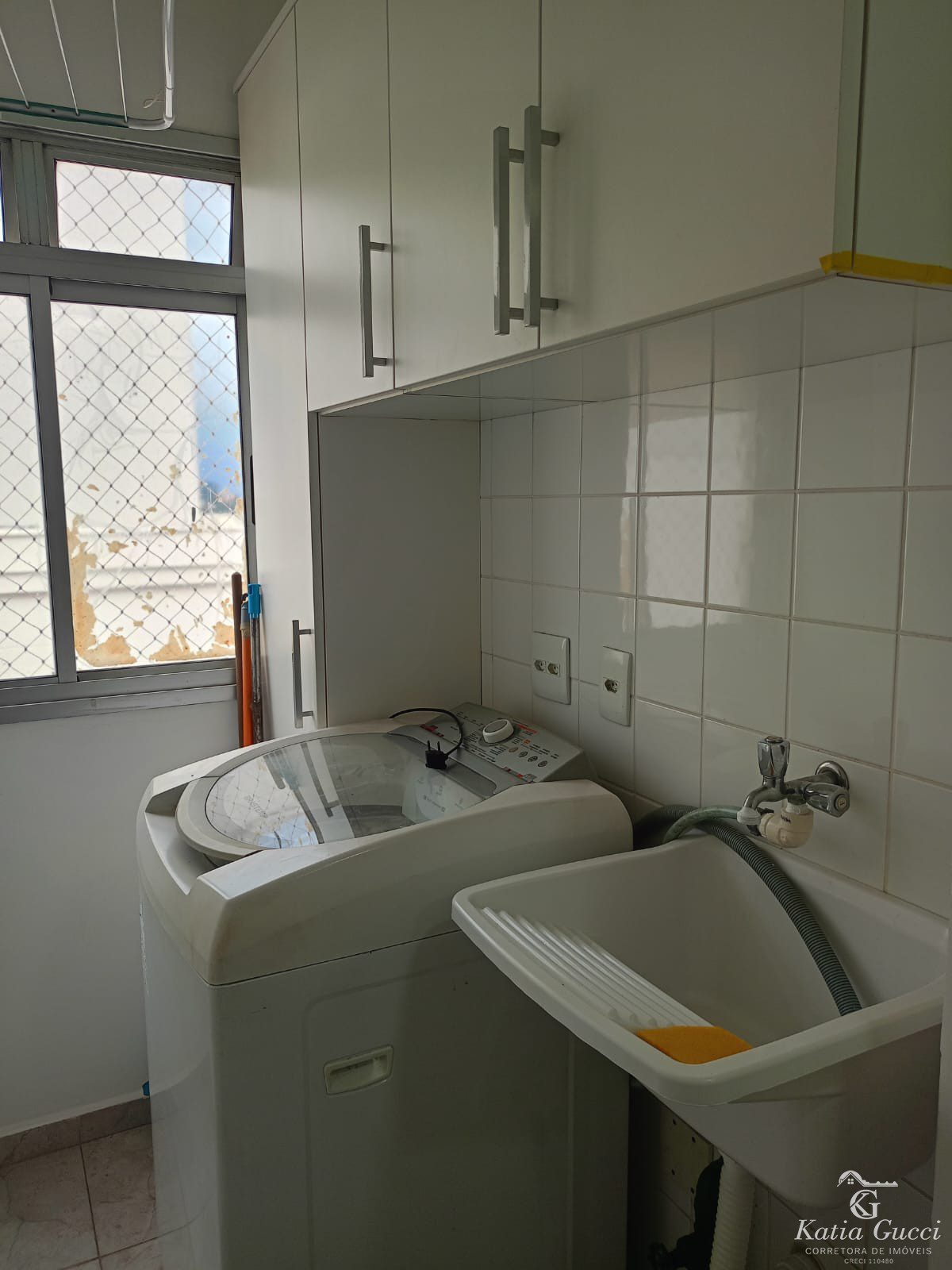 Área de Serviço: Lavanderia com armários sob medida e máquina de lavar.