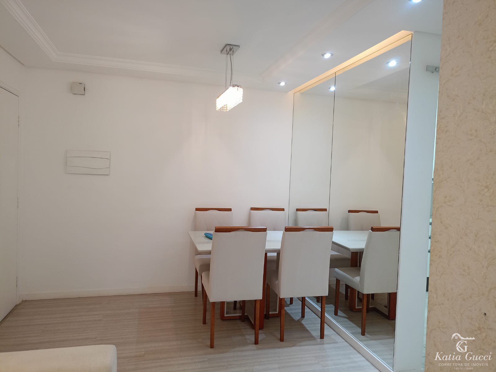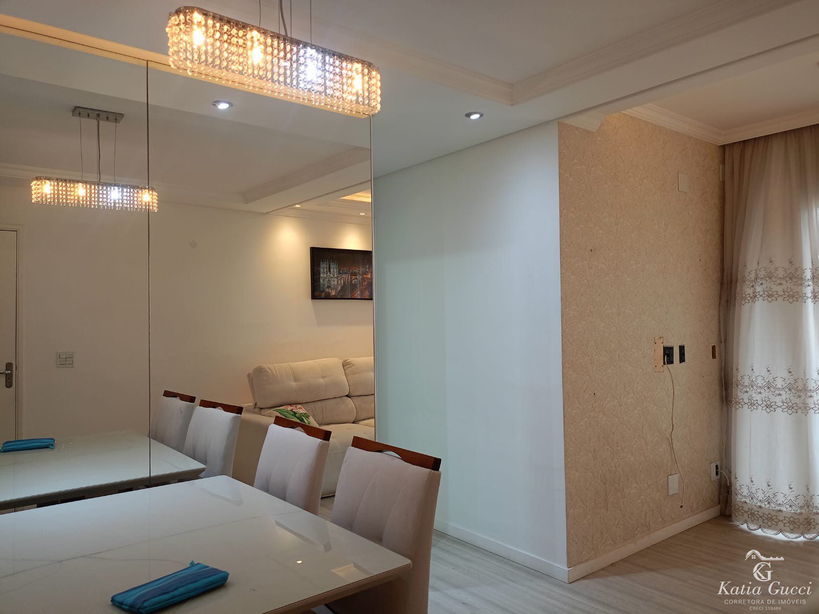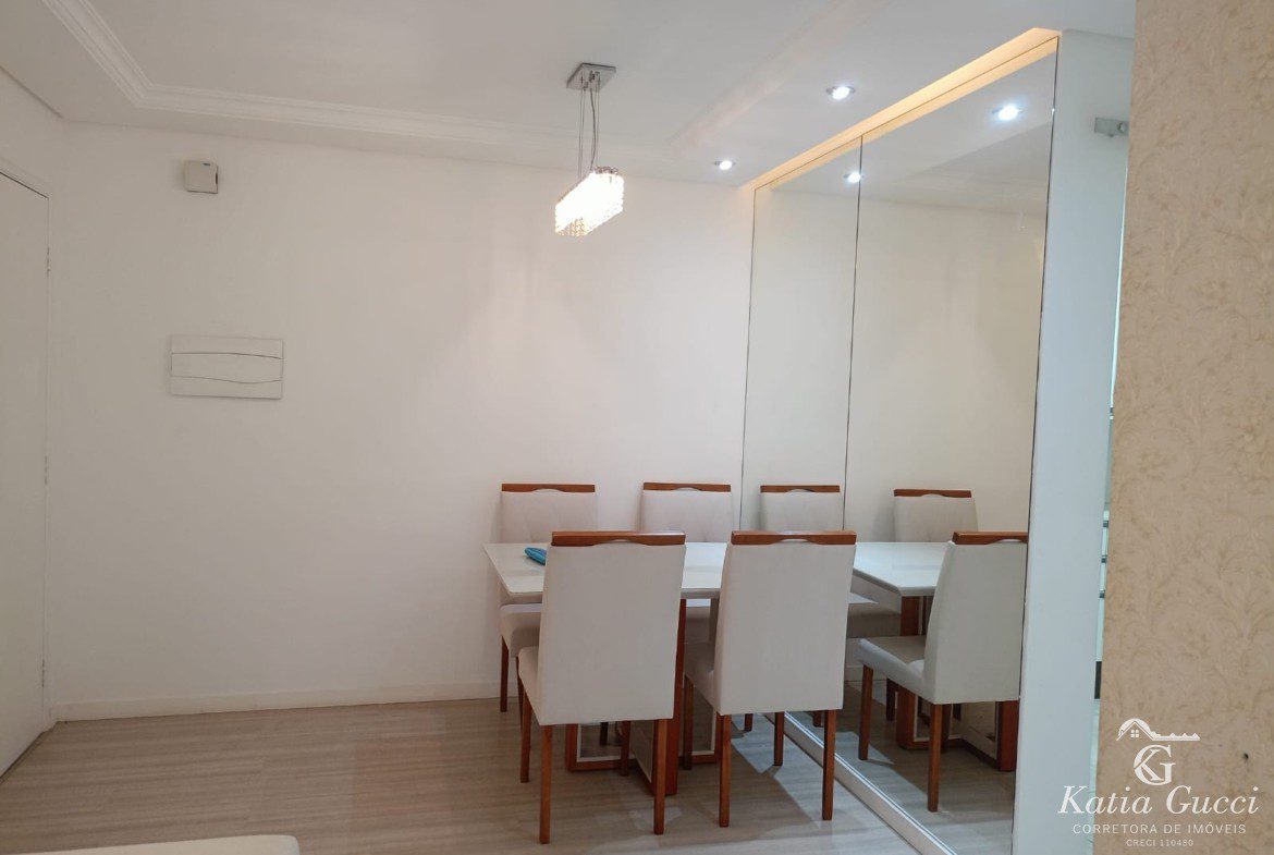 Living: Sala para 02 ambientes equipada com sofá confortável e mesa de jantar com 06 cadeiras.
